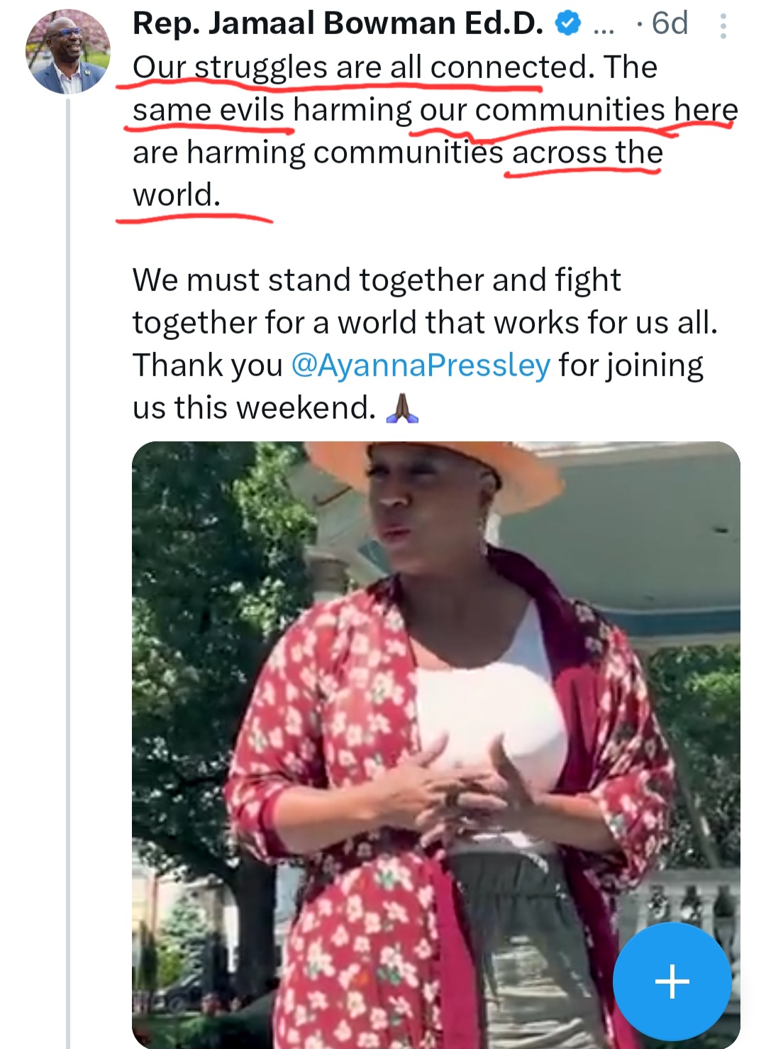 Post by Rep. Jamaal Bowman who was primaried by George Latimer with the support of AIPAC because of his demonization of Israel and anti-Israel and Jew ambivalent actions, posting on X about ‘Palestine’ in a reflection of the Harris loss. Seemingly looking for a job among the socialist-jihadi alliance.
