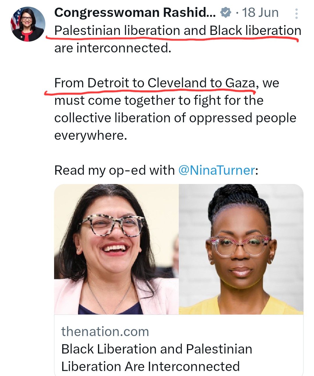 Comrade Rashida Tlaib shared “Palestinian liberation and Black liberation are interconnected. From Detroit to Cleveland to Gaza.”