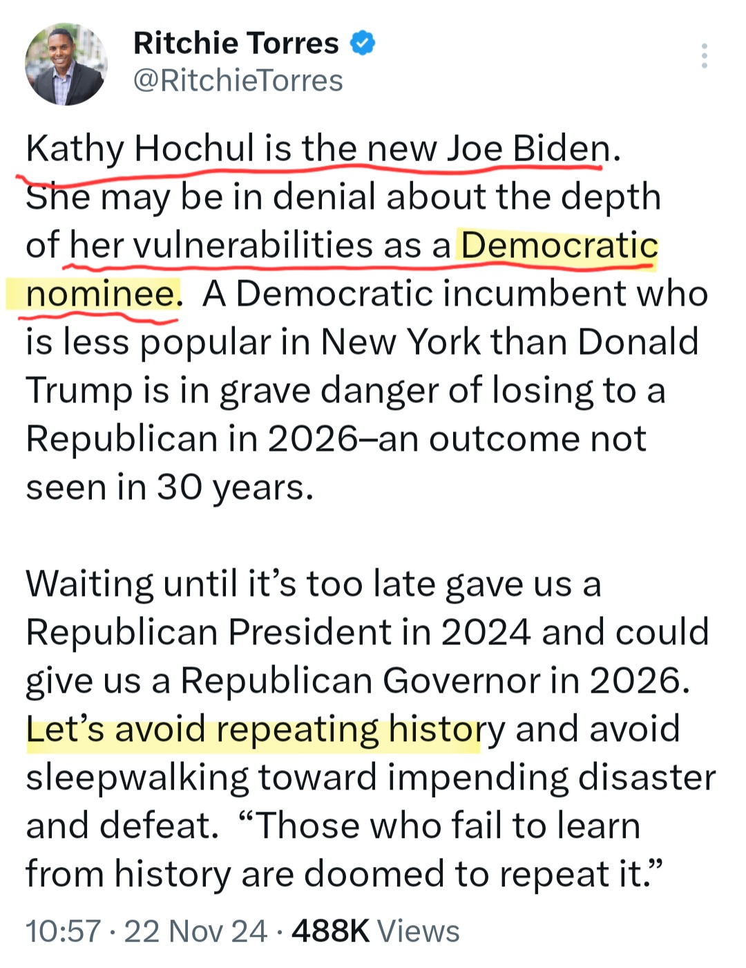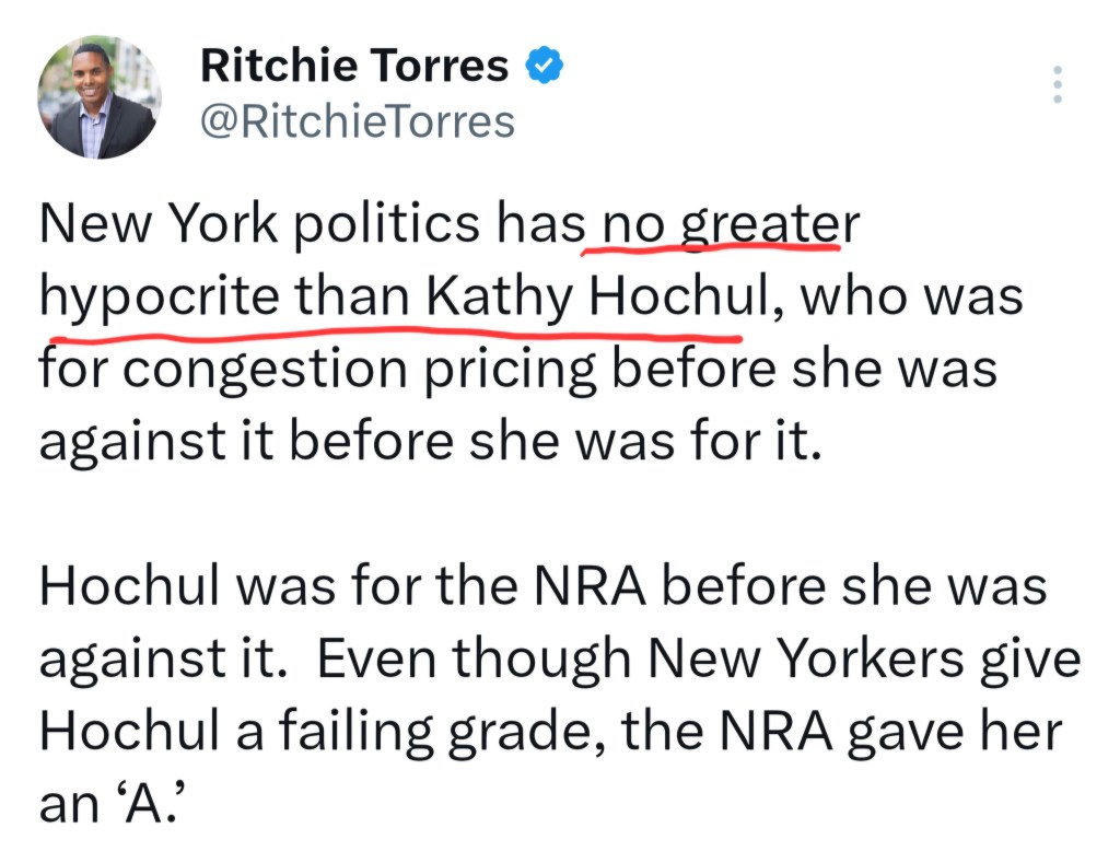 On November 21, Torres said there was a “poverty of governance in New York” as well as a “leadership crisis.” The next day he called Hochul “the new Joe Biden” who is so clueless about “her vulnerabilities as a Democratic nominee,” that allowing the Democratic machine to prop her up will “give us a Republican Governor in 2026.”