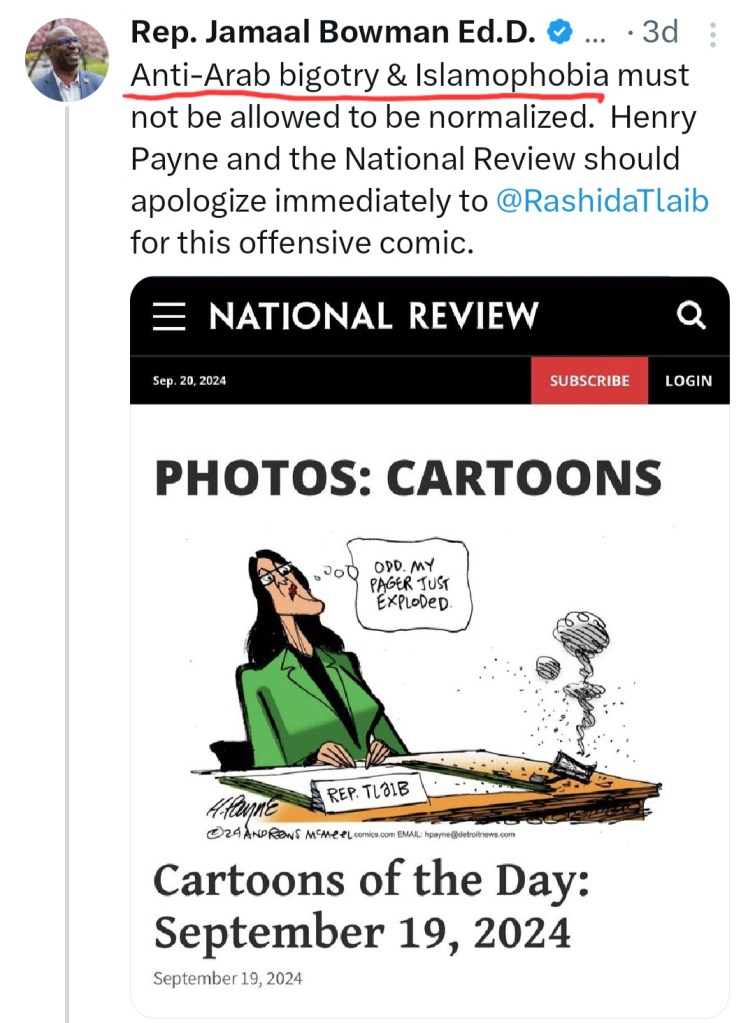 The National Review posted a cartoon in the aftermath of the political-terrorist group Hezbollah’s pagers blowing up around Lebanon and Syria, of U.S. Representative Rashida Tlaib (D-MI) sitting at her desk and pondering why her pager had just exploded. In response, many of her alt-left comrades rallied to her and accused the right-leaning media company of racism.