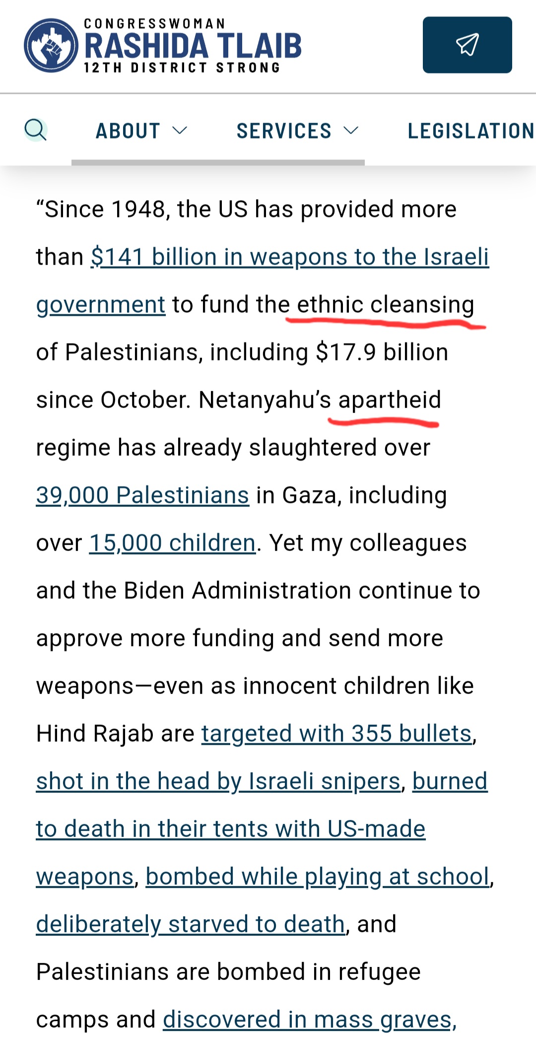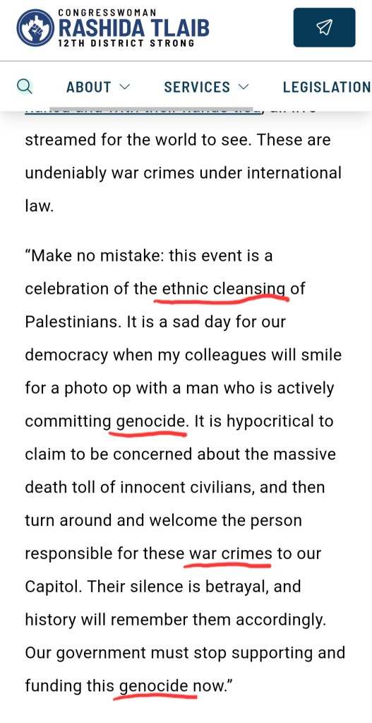 Tlaib has a history of falsely attacking Israel as engaging in “ethnic cleansing”, “apartheid” and “genocide.” She has also refused to call for Hamas to be held accountable for actual premediated genocide and ethnic cleansing. She seemingly believes that the best defense for Palestinian Arab terrorism is to go on the attack to make their evil actions appear warranted.
