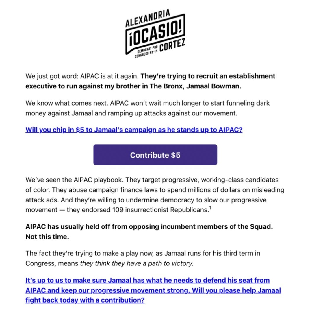 AIPAC. Why start an ad against a bipartisan pro-Israel group? Because the essence of what AOC and Bowman represent is hyper-partisan anti-Israel legislation.
