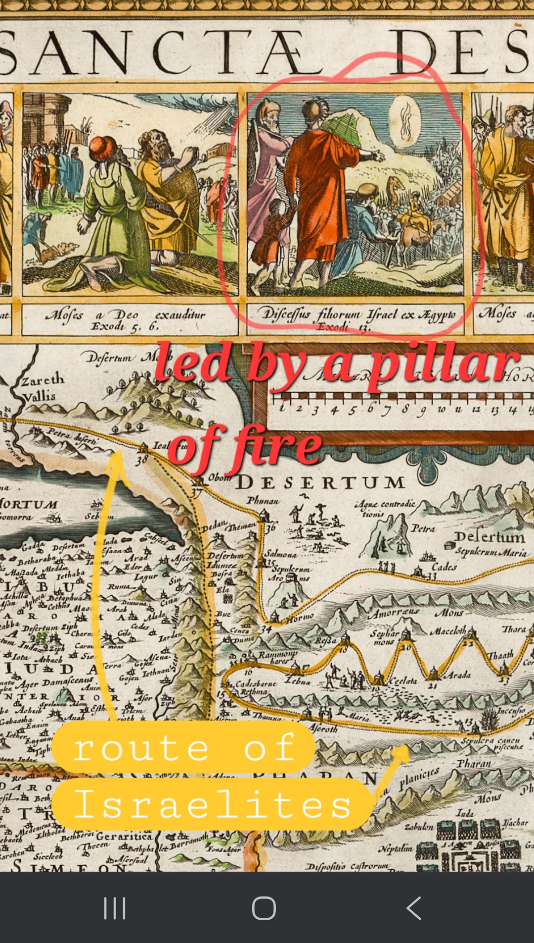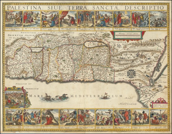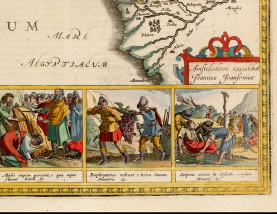 Jan Jansson (1588-1664) map of the Holy Land (c. 1630) showing the life of Moses in vignettes and the organization and route of the Israelites through the desert and then Moab above the Dead Sea on the map on their way to the Promised Land