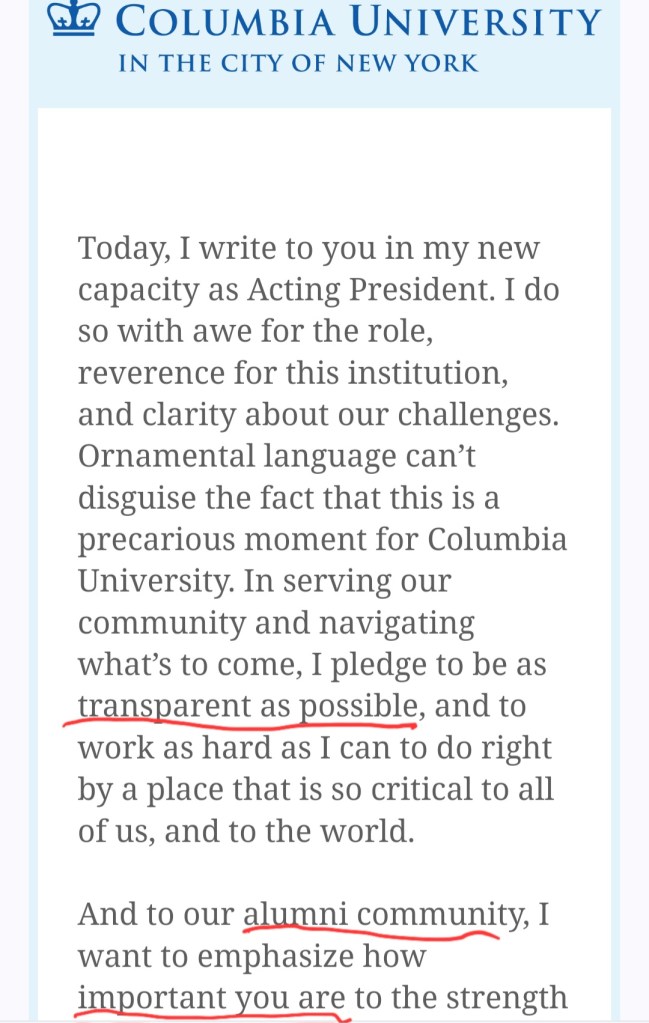 Shipman said she wants to hear from you. Contact her and the school at officeofthepresident@columbia.edu, alumdev@columbia.edu and secretary@columbia.edu. The phone number is (212) 854-9970