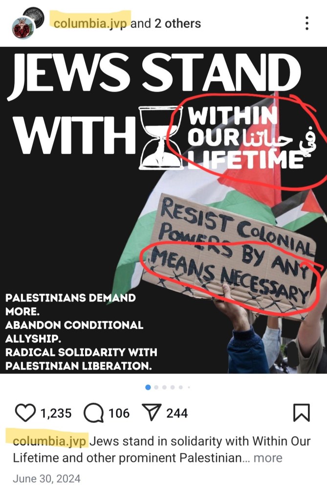 Columbia’s chapter of JVP was more explicit about violence “by any means necessary,” like the October 7 massacre.