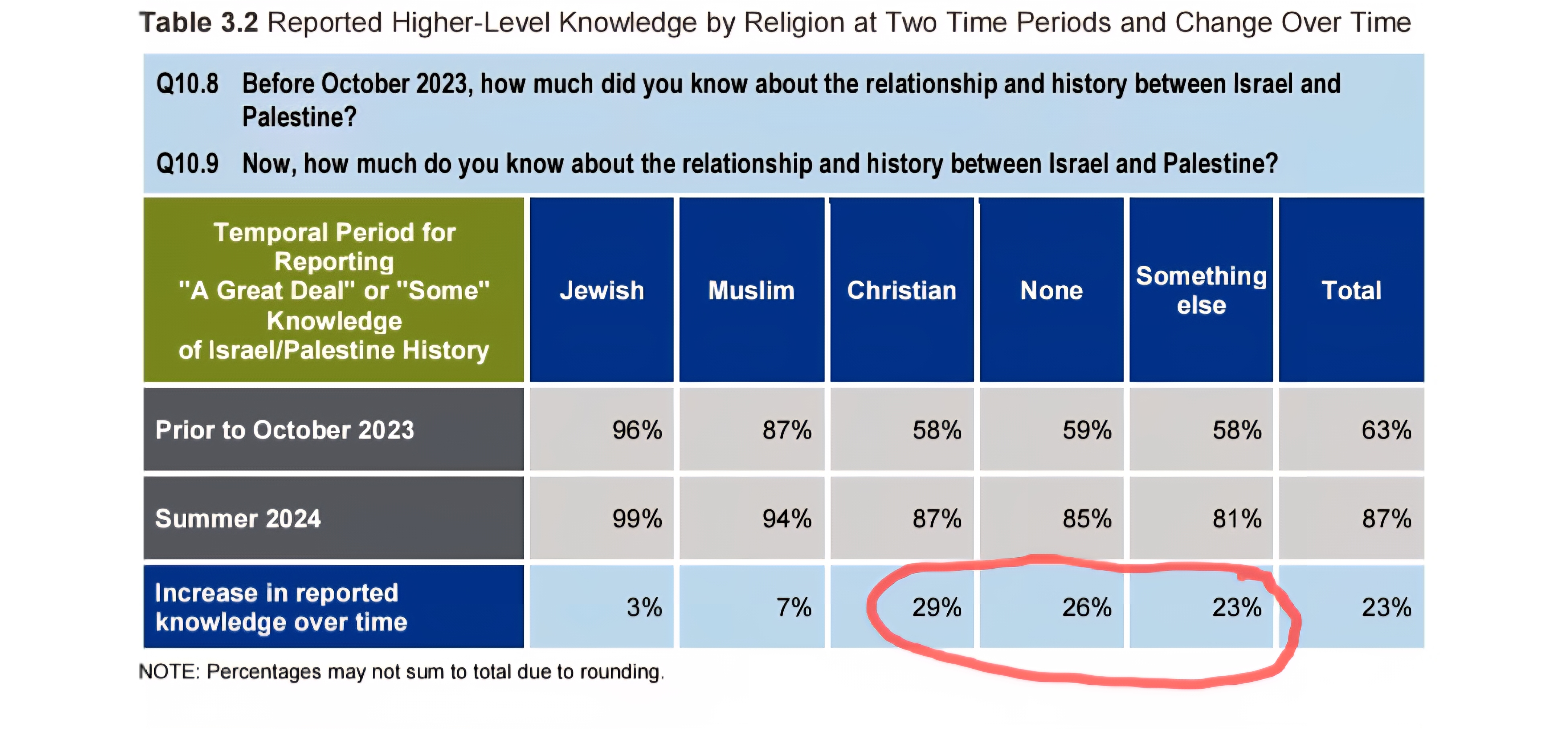And while Jews felt the most stress over the period, they are learning the least. The campus protest barely taught them anything about the regional dynamic. But Christian and other faiths learned a lot – of pro-Palestinian narrative.