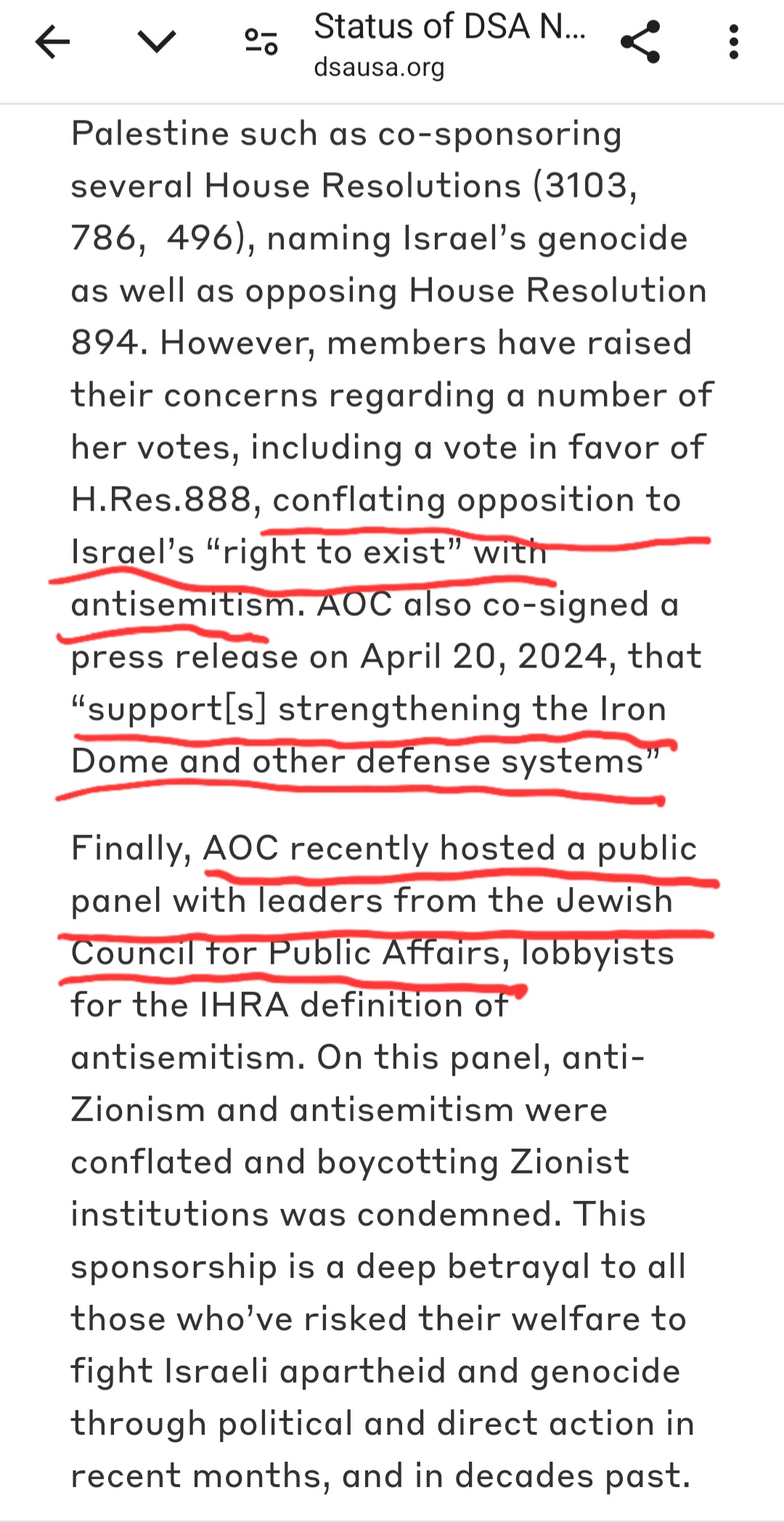 In its July 10, 2024 statement, the DSA focused on three offenses committed by AOC: “a vote in favor of H.Res.888”; cosigning “a press release on April 20, 2024, that “support[s] strengthening the Iron Dome and other defense systems”; and hosting “a public panel with leaders from the Jewish Council for Public Affairs.”