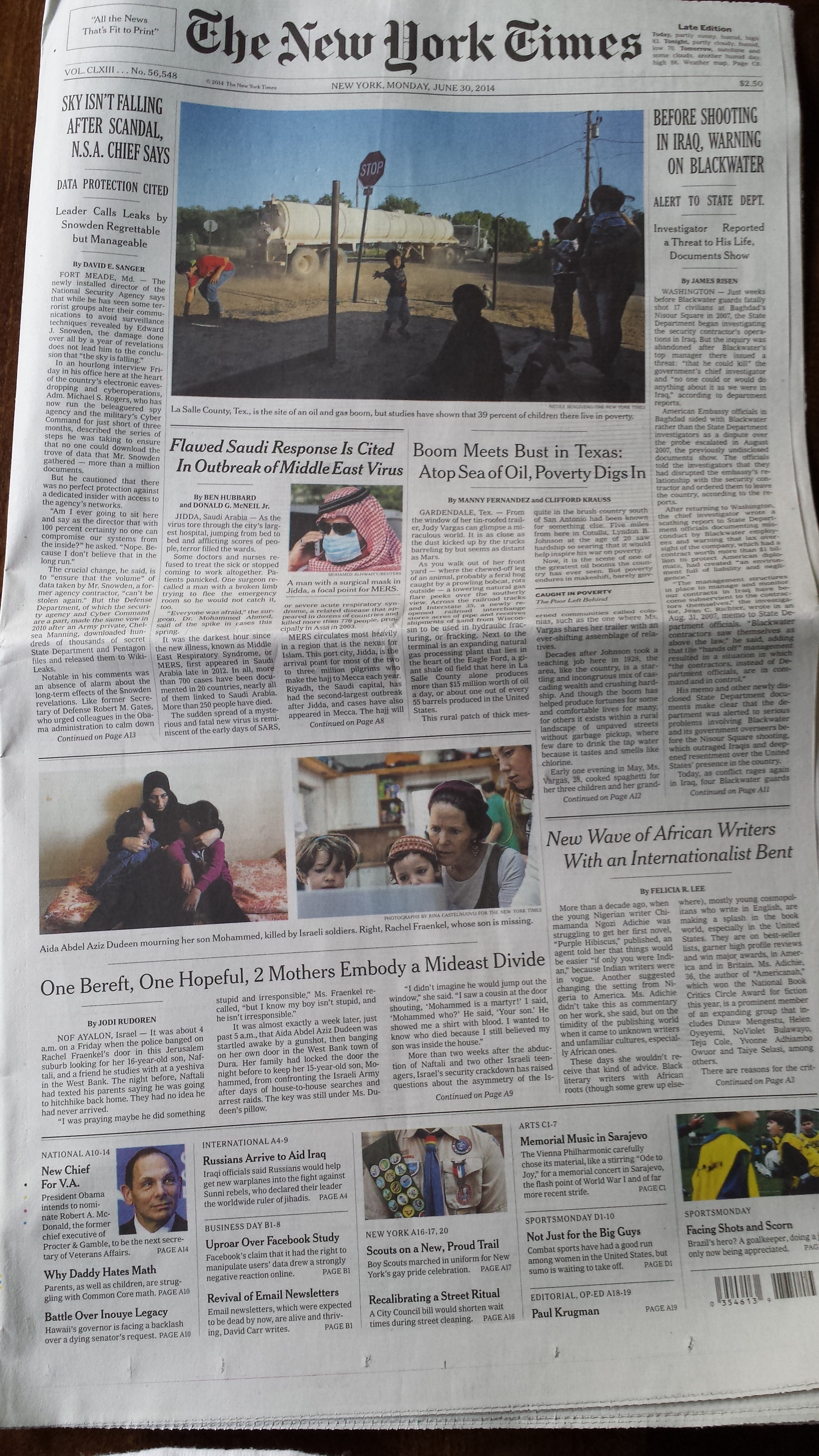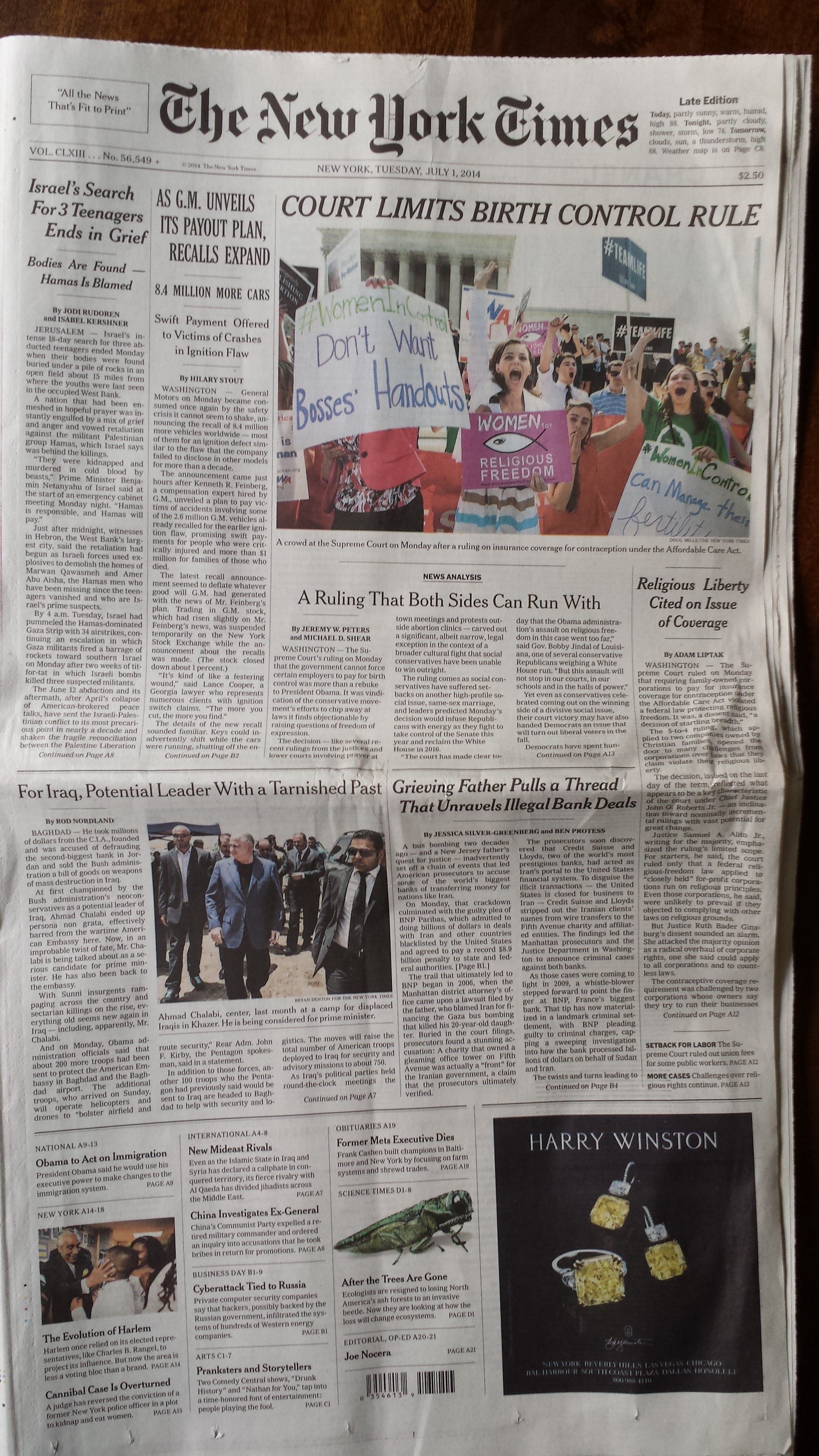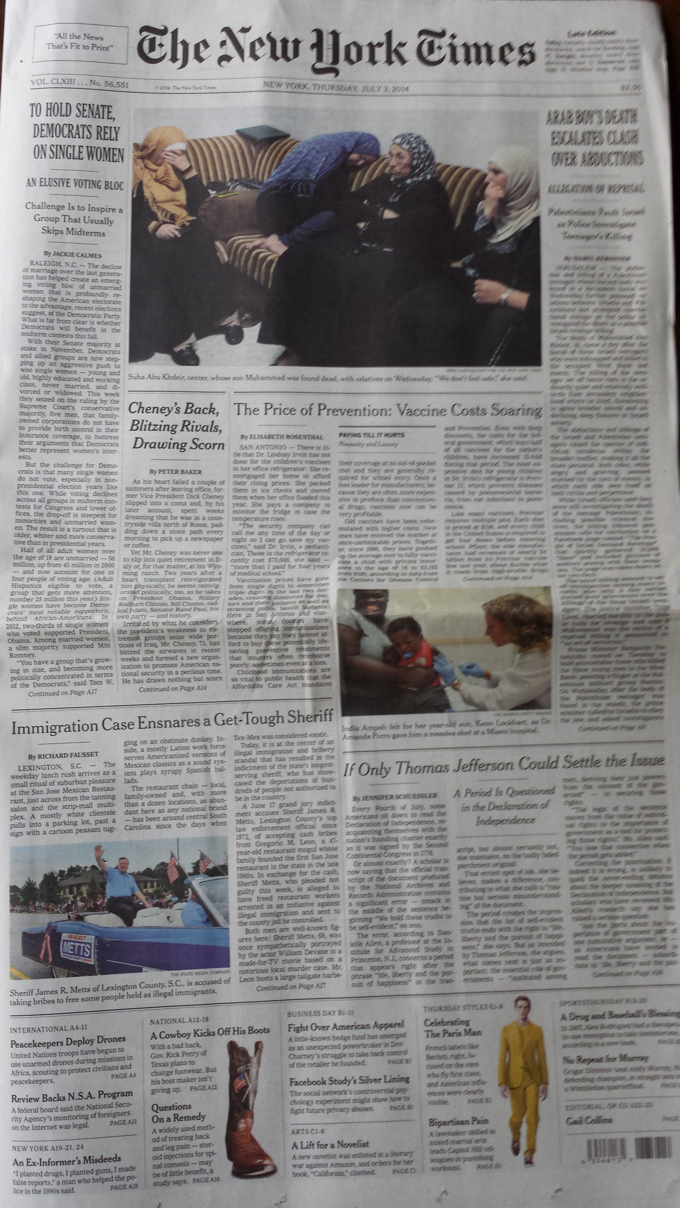 On July 3, the NYT posted a large color photograph on the top of the page of Arab women mourning and an associated right-hand column about the killing of an Arab boy (the trifecta – large color photo on top of page 1 and associated right-hand article). The caption said her “son Mohammed was found dead” included a quote from the mother of the dead boy “We don’t feel safe”. The cover article continued on page A8 with three additional color photographs of: Palestinian men clashing with Israeli police; Israeli police searching the crime scene; and the dead boy. The captions state that there was a “kidnapping and killing of a Palestinian teenager”.