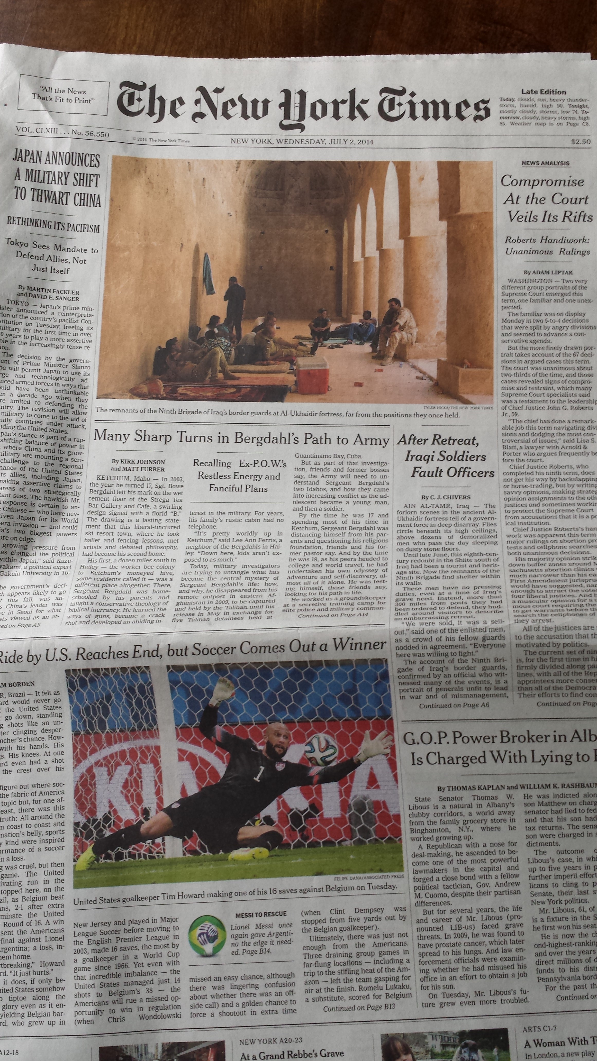On July 1, the NYT ran a cover story that the Israeli teens were found dead. The story ran on the left hand (secondary) column of the front page and had no picture. The paper did, however, include several color photographs in the middle of the paper, on page A8, of a prayer vigil, pictures of the three boys, and army jeeps near the discovery site of the boys. The caption reads that their bodies “were found”.