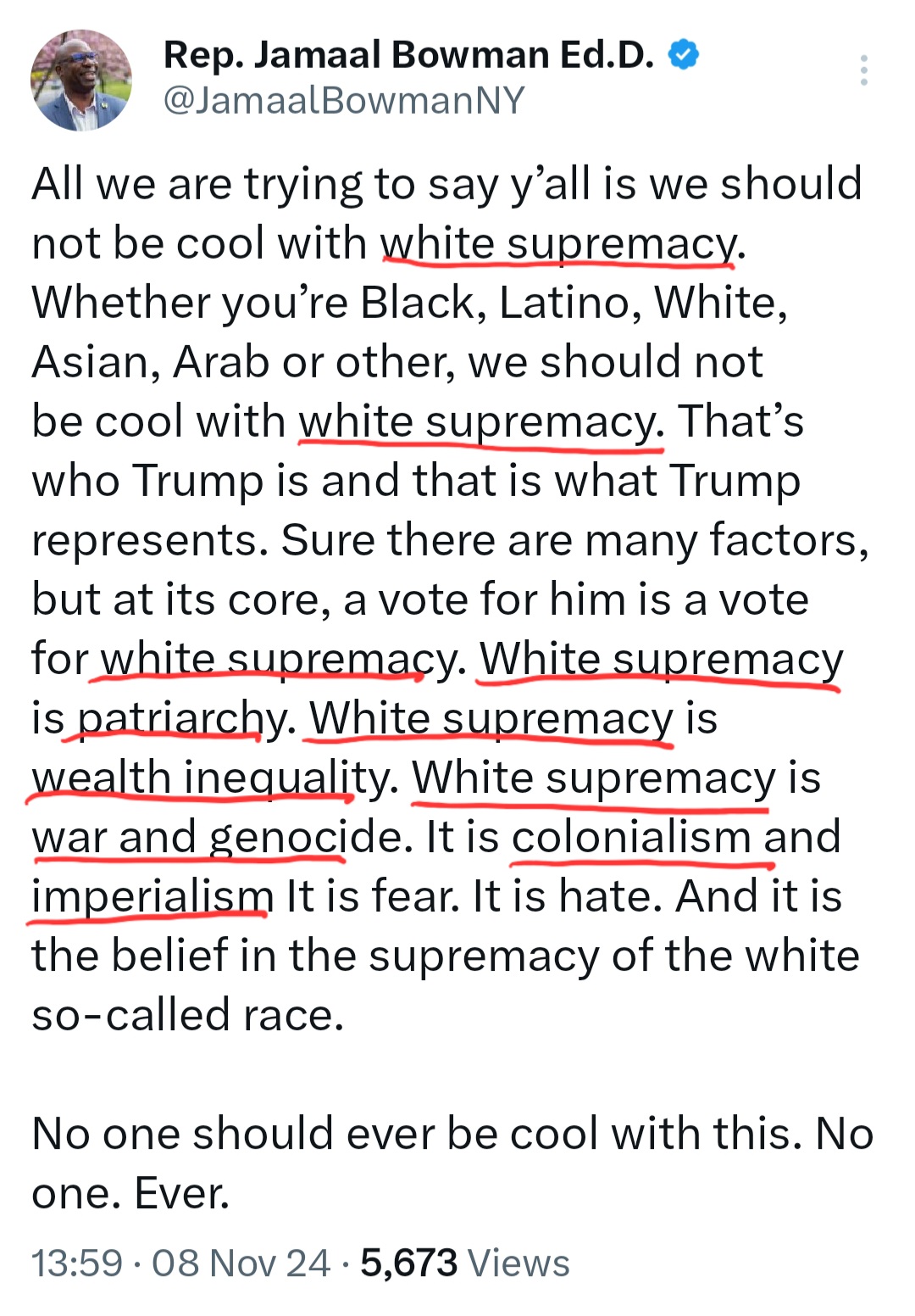 Shouting “fire” in a crowded theater is a criminal offense for causing imminent harm, while cross-burnings on Black property is illegal for causing intimidation and creating “a pervasive fear in victims that they are a target of violence.” How is shouting “kill the Jews” not condemned clearly and instead marketed as “peaceful protests” by far-left politicians like Rep. Jamaal Bowman?