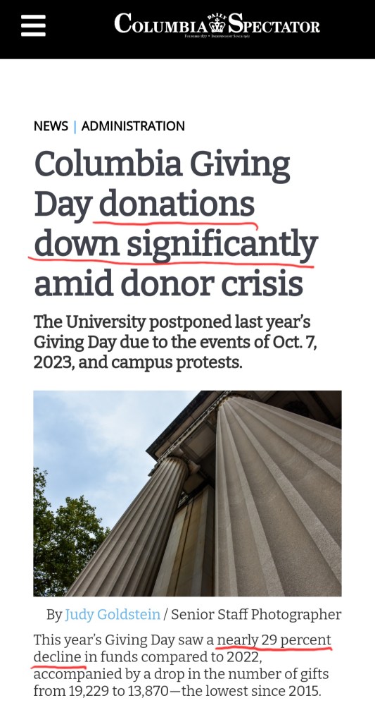 Individuals are scoring victories too. In October 2024, Columbia University’s paper announced that alumni are shunning their alma mater. It is likely due to the school’s disgusting treatment of Jews.
