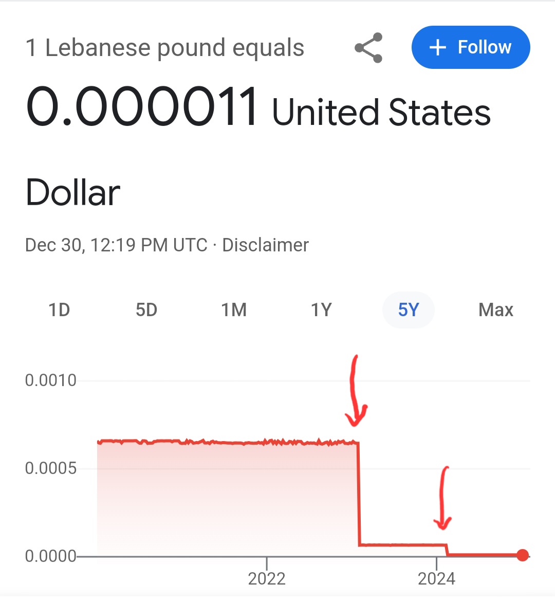 Currency exchange of Lebanon lira to US dollar, with spikes in February 2023 and February 2024