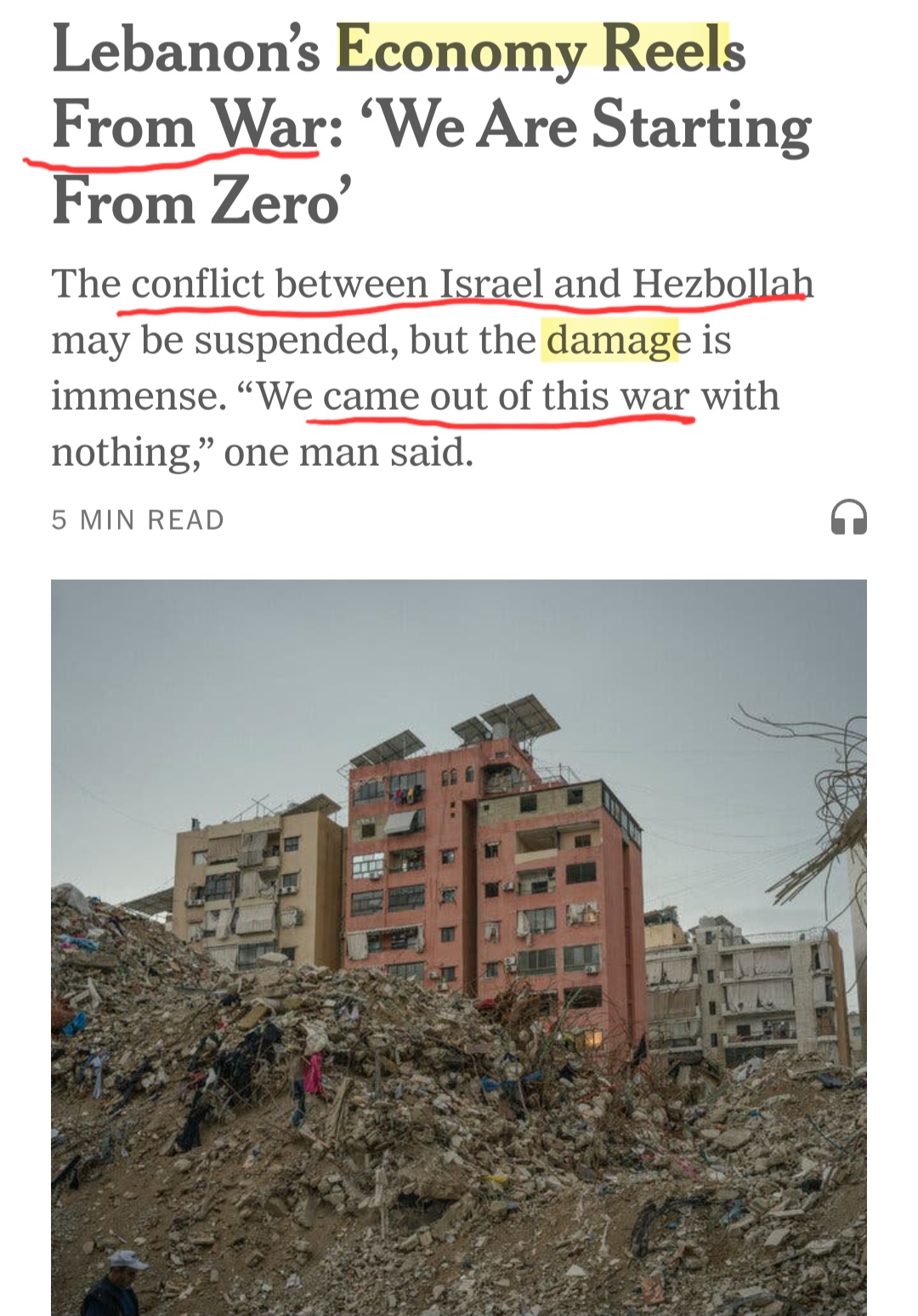 On December 30, 2024, the Times ran an article with a headline “Lebanon’s Economy Reels From War: ‘We Are Starting From Zero'” with a sub-title that pinned the matter on “the conflict between Israel and Hezbollah.”