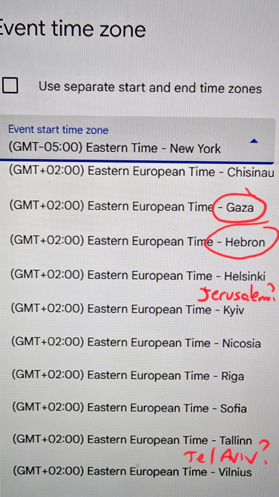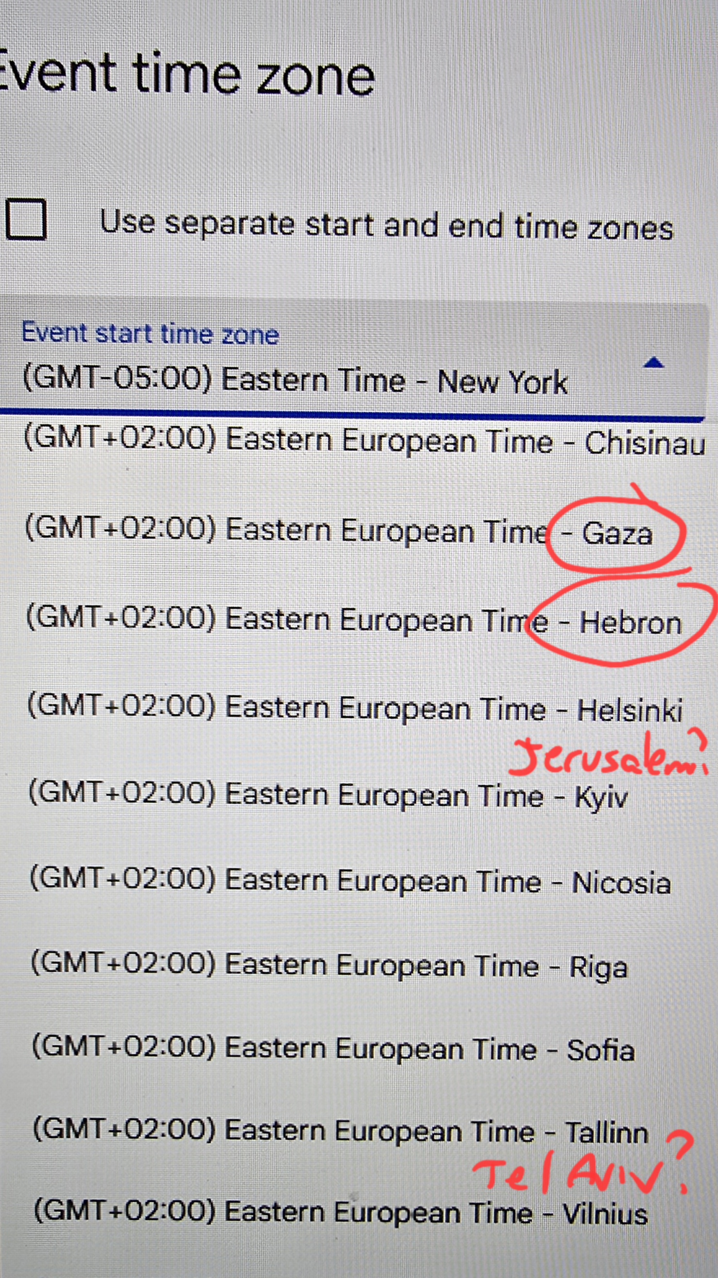 To use Google’s calendar function, one is left with some odd choices to find the time zone in Israel. Rather than showcasing capital and major cities like Jerusalem, Tel Aviv and Haifa – cities where Google has a presence – the company shows time zones for Gaza and Hebron.