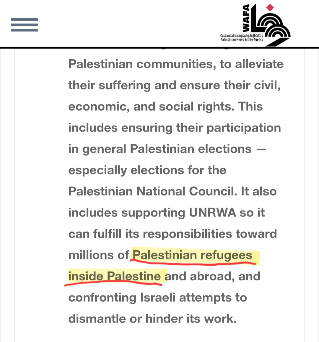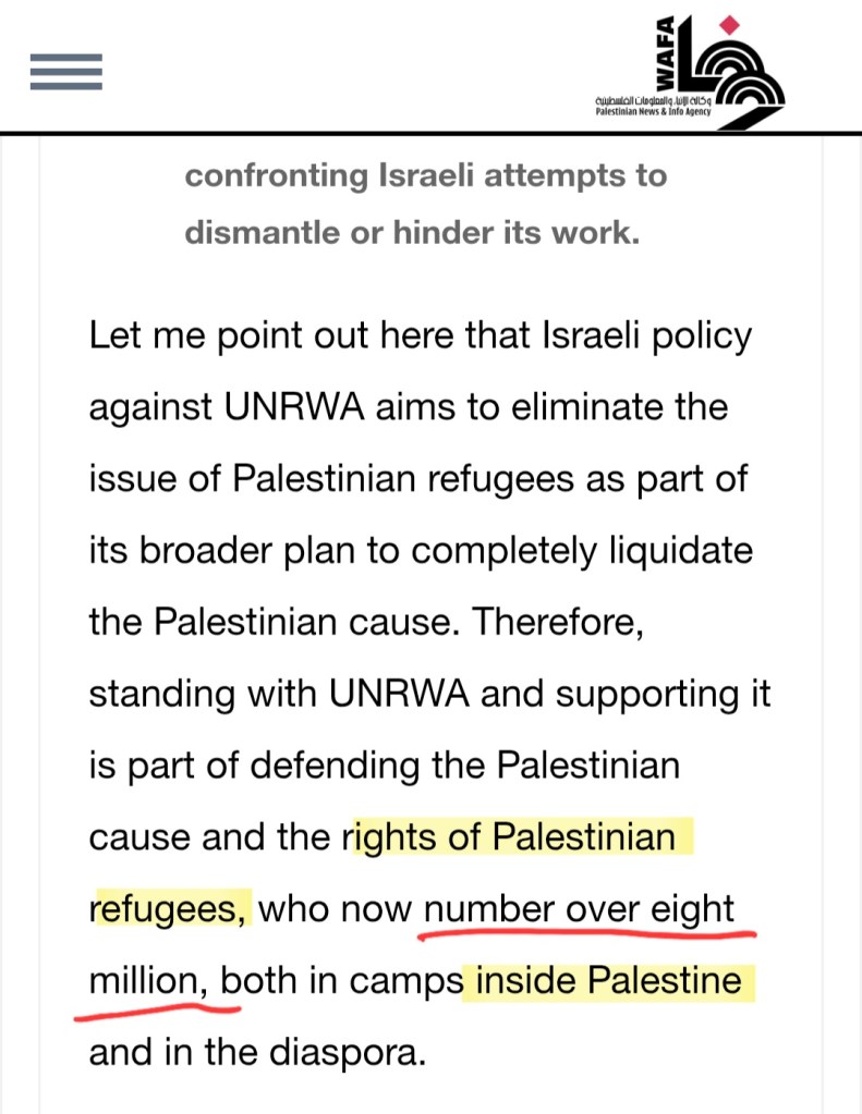 Israeli Arabs and Palestinian Arabs are Refugees. This is a curious mind-bending twist of language. In different sections of his speech, Abbas said that there are “over eight million” “Palestinian refugees… inside Palestine and in the diaspora.” UNRWA lists 6 million wards in its five areas of operation, Gaza, E49AL/West Bank, Jordan, Syria and Lebanon. The two million Arabs in Israel would get to Abbas’s 8 million.