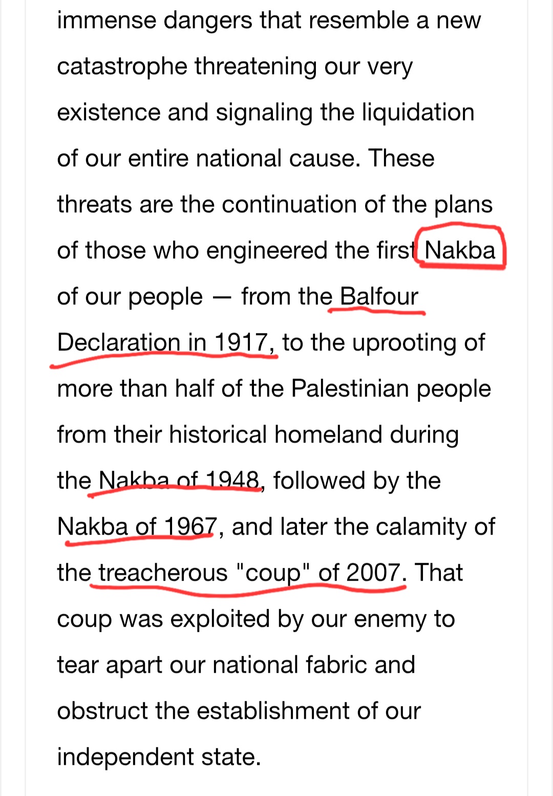 There have been FOUR Nakbas. While Arabs normally reserve the word “Nakba” for the 1948 loss of the war they initiated against Israel, Abbas added the 1917 Balfour Declaration of the Judeo-Christian western world recognizing the history of Jews in their holy land and right to reestablish their homeland as the primary “catastrophe.” He added the loss of the 1967 war to destroy Israel in which Jordan lost E49AL/”West Bank”, Egypt lost Gaza and the Sinai, and Syria lost the Golan Heights. Noteworthy, Abbas added the 2007 Hamas “treacherous coup” in Gaza in which it expelled the PA as a fourth Nakba, setting back the mission of Palestinian statehood.