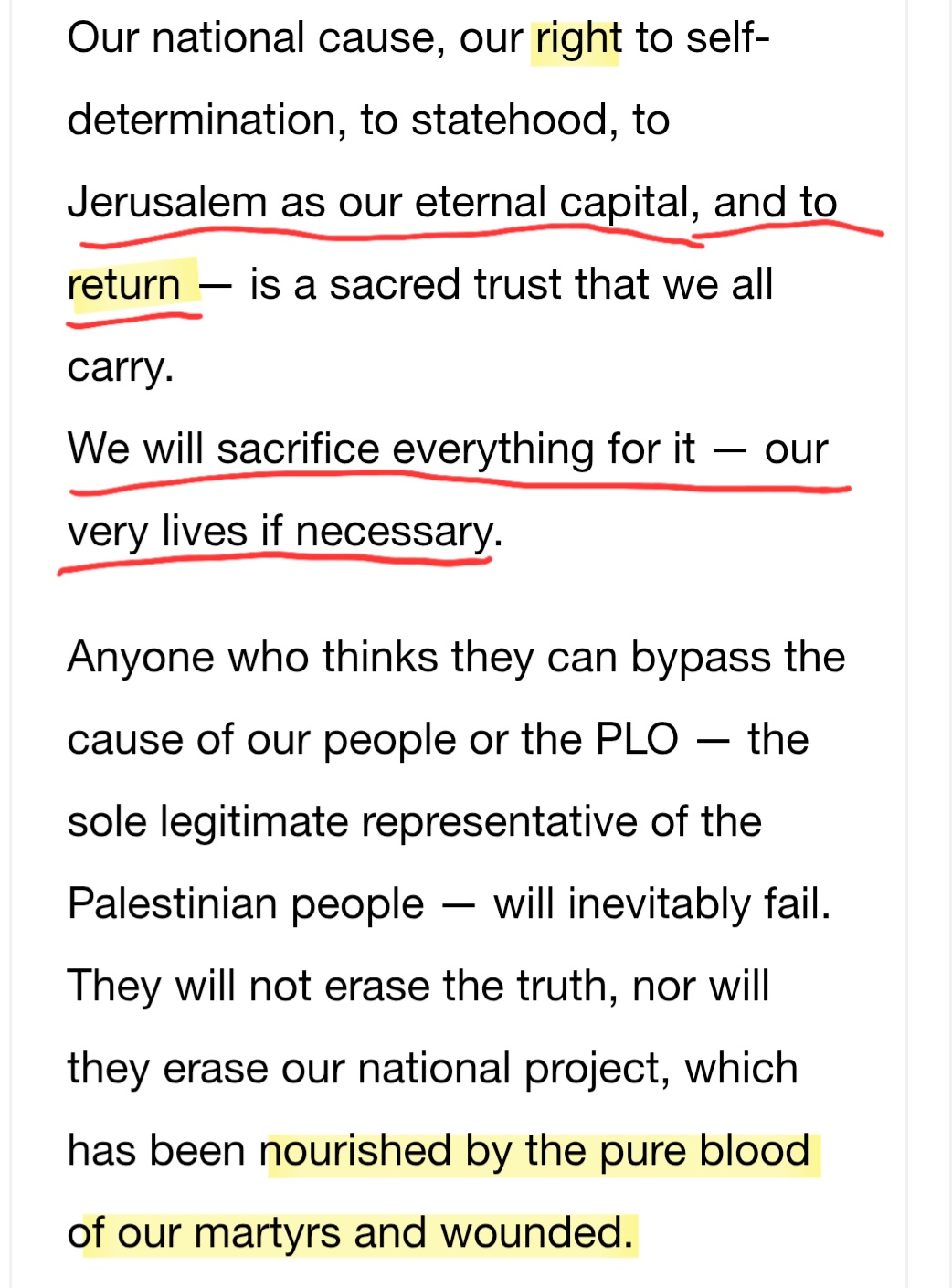 On April 23, 2025, he gave a long speech in Ramallah, which he hoped would craft a new narrative and make the PA a political force throughout the region. Here are some highlights: