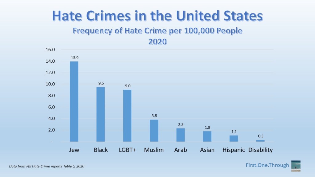 In 2019, an average American Jew was roughly three times more likely to suffer a hate crime than an average Muslim (1,032 Jewish victims in a population of 5.7 million versus 227 Muslim victims in a population of 3.3 million). Jews always suffered more than Muslims and the gap is growing.