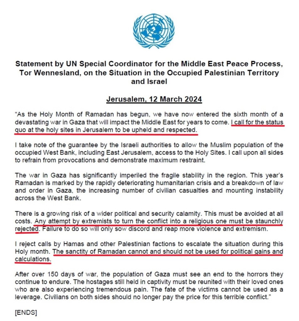 Wennesland is obviously familiar with Hamas, its charter and philosophy. He knows that Palestinian Arabs support the group and the savage attack on Israelis on October 7. He therefore opted to don an Islamic tunic, promote himself and declare a fatwa that “The sanctity of Ramadan cannot and should not be used for political gains and calculations.” A curious declaration from a Christian to tell Muslims what to do with their holy month of Ramadan.