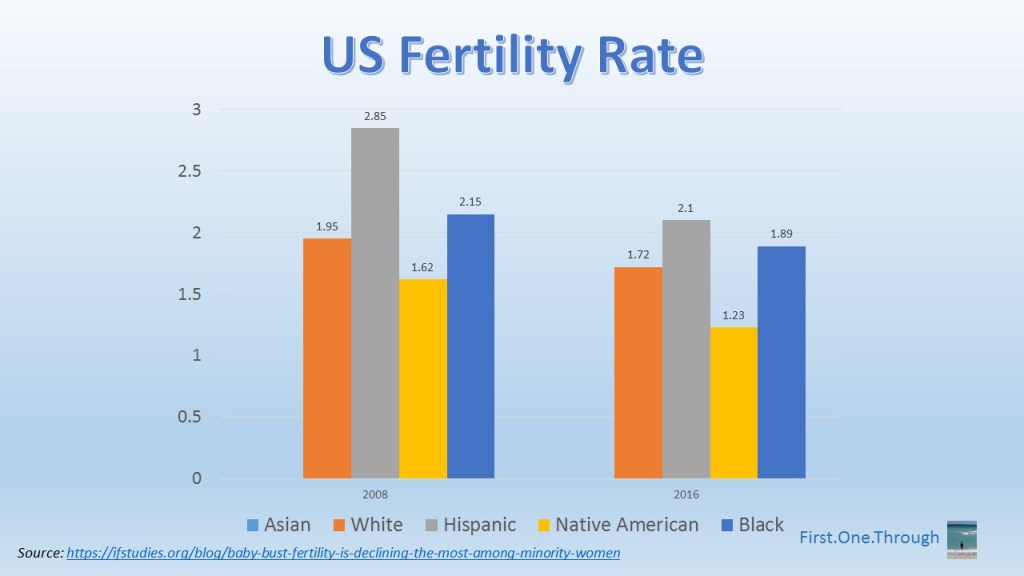 As seen in the US Fertility Rate table above, the fertility rate for women of all races declined significantly between 2008 and 2016. The drop was greatest for Hispanic women (-26%) and Native Americans (-24%), followed by Whites and Blacks (-12% each).