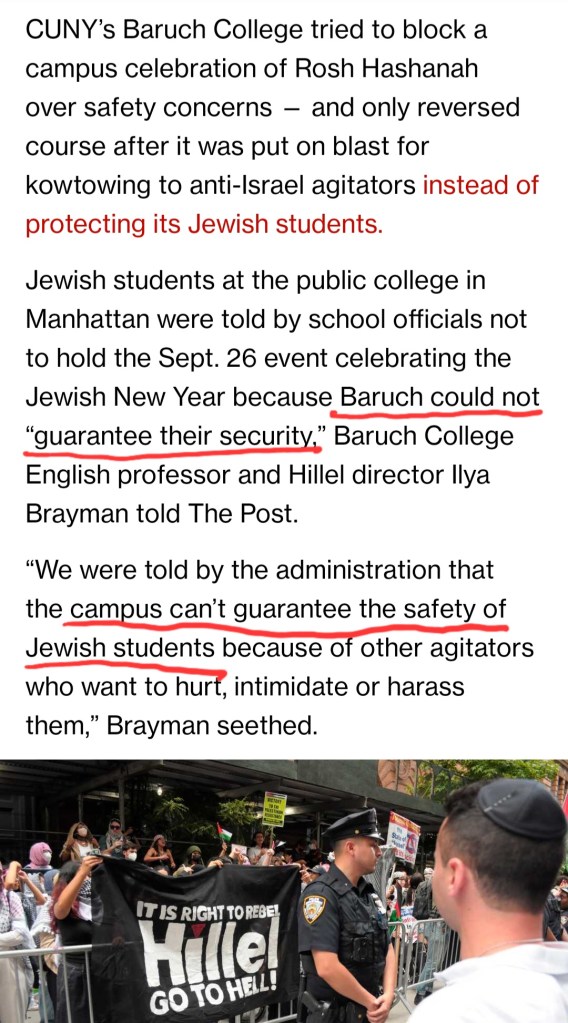 In April 2024, the rabbi at Columbia University told the Jewish students to leave campus and return home in an email stating that the school’s policies “have made it clear that Columbia University’s Public Safety and the NYPD cannot guarantee Jewish students’ safety.” It has continued into the Fall 2024 semester, when another New York City school, CUNY’s Baruch College told Jewish students that they could not hold a Rosh Hashana celebration because the school could not “guarantee their security.”