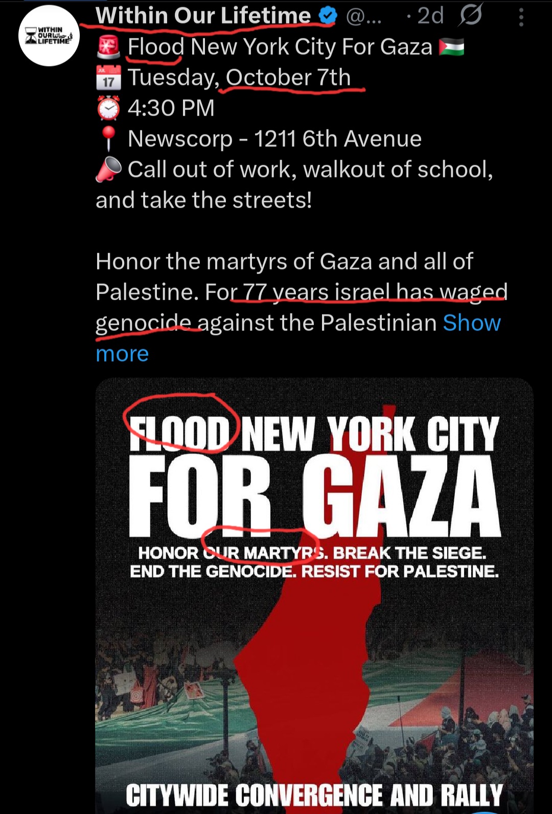 The “rally” was called a “Flood”, echoing Hamas’s term for the October 7 massacre, the “Al Aqsa Flood.” It includes a map of all of Israel claiming Israel’s 77 years of existence has been a “genocide” against Palestinians. It writes Israel with a lower case ‘i” meant as an insult to not recognize it, preferring to call it a “Zionist project.” The rally is a call to stand against “Zionism” and “honor the martyrs” who slaughtered people in Israel two years ago.