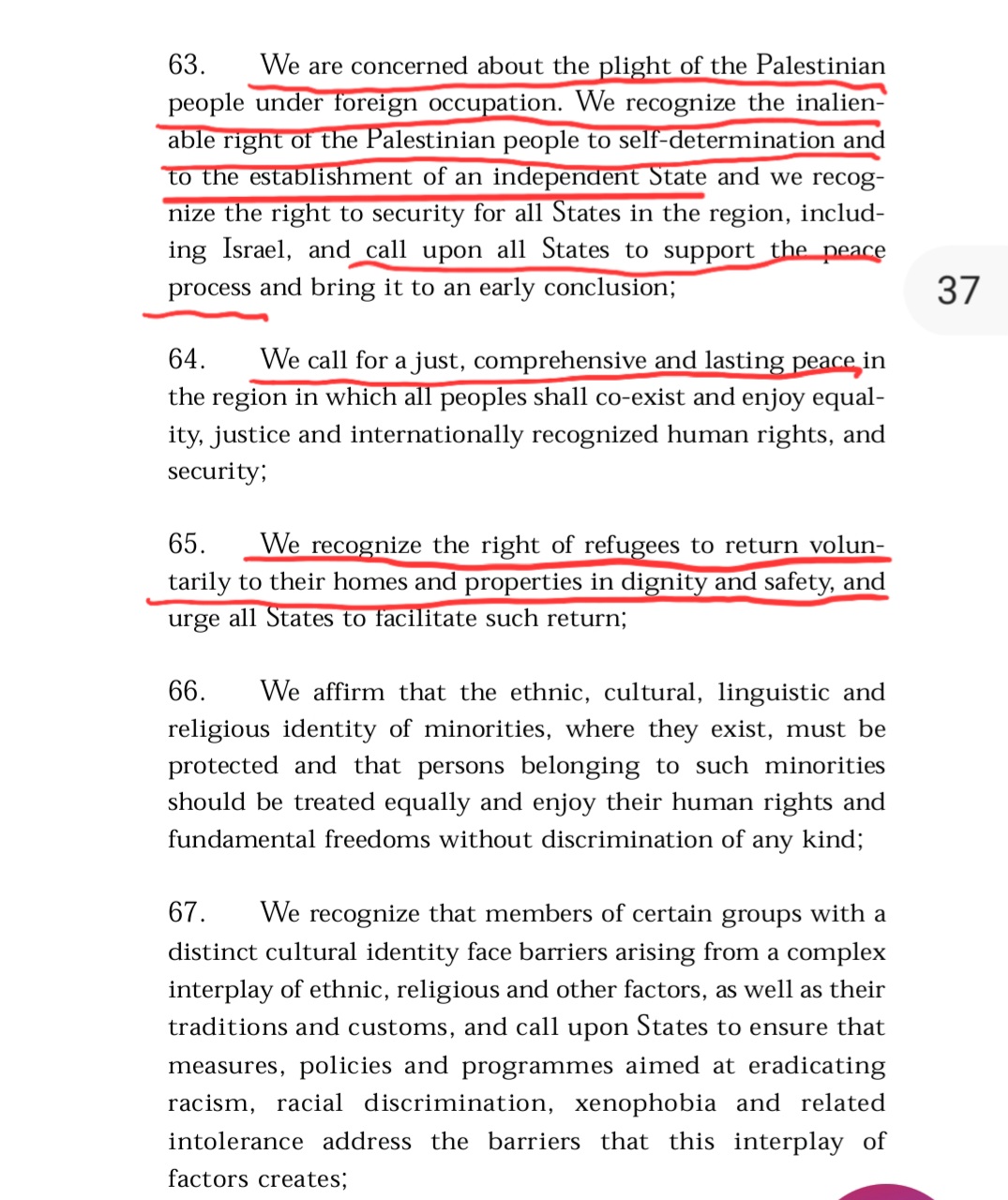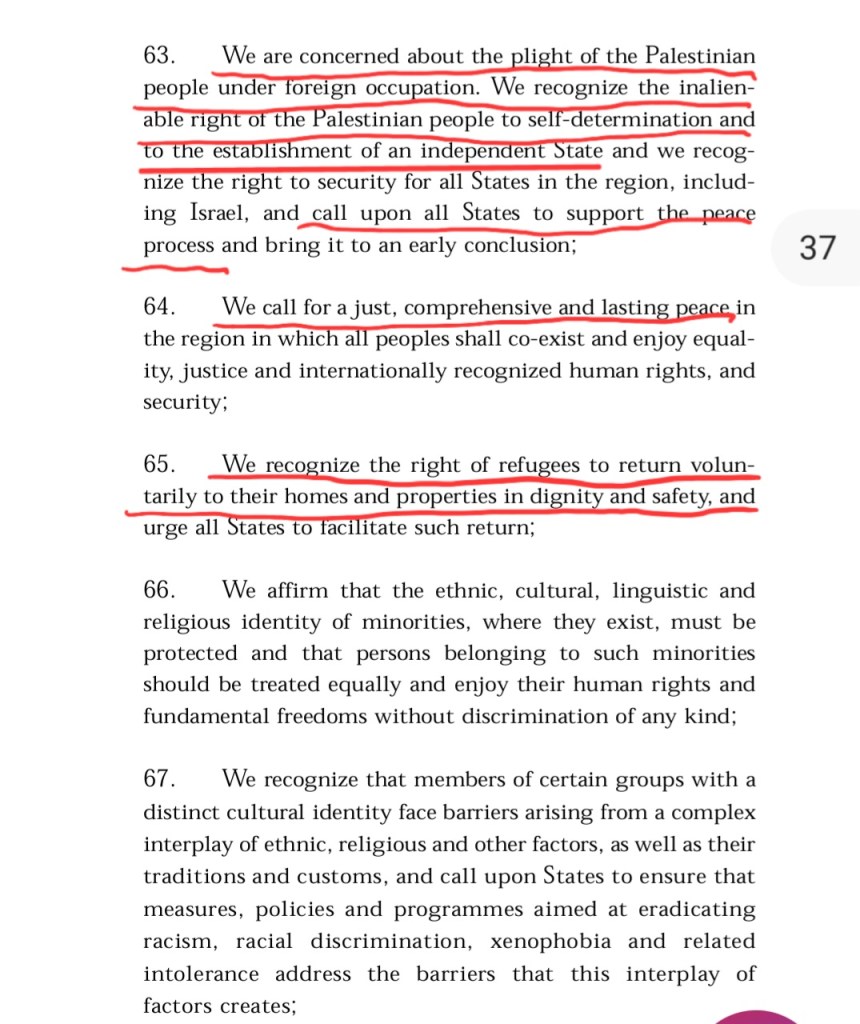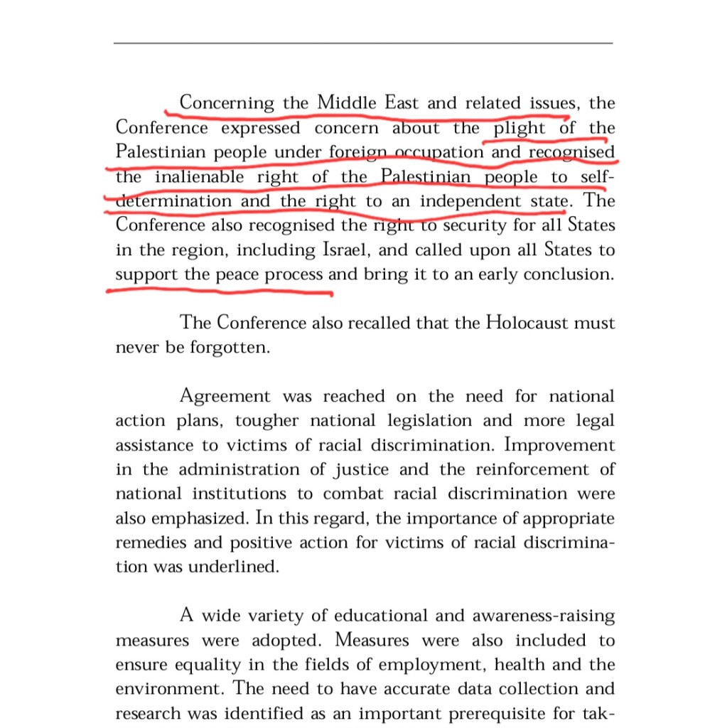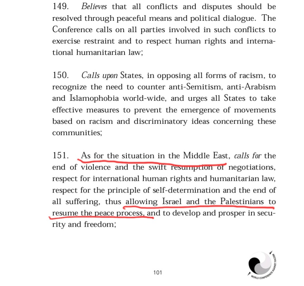 The document included a call for Palestinian refugees “to return voluntarily to their homes and properties,” making it an individual right outside of negotiations between Israel and the Palestinian Authority. In a 100+ page global document about racism.