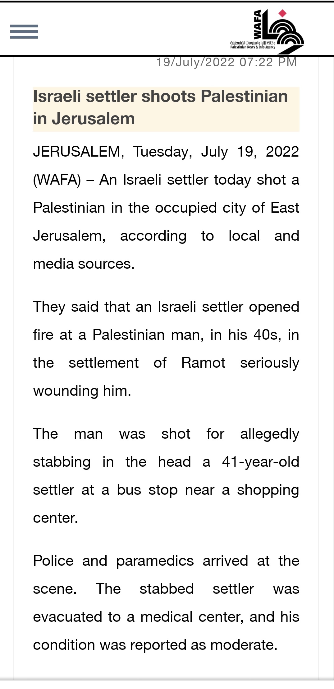 Palestinian media covered the event with the header “Israeli settler shoots Palestinian in Jerusalem,” making the incident appear as an unprovoked Israeli attack on Arabs, absolution via inversion.