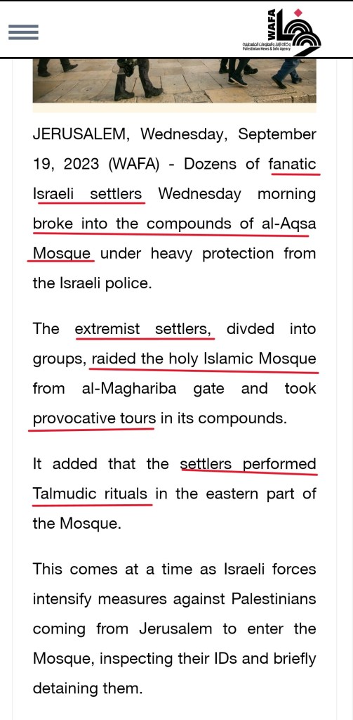 “JERUSALEM, Wednesday, October 25, 2023 (WAFA) – Dozens of Israeli settlers Wednesday morning stormed the Al-Aqsa Mosque compound in occupied Jerusalem, under protection from Israeli occupation police, according to local sources.