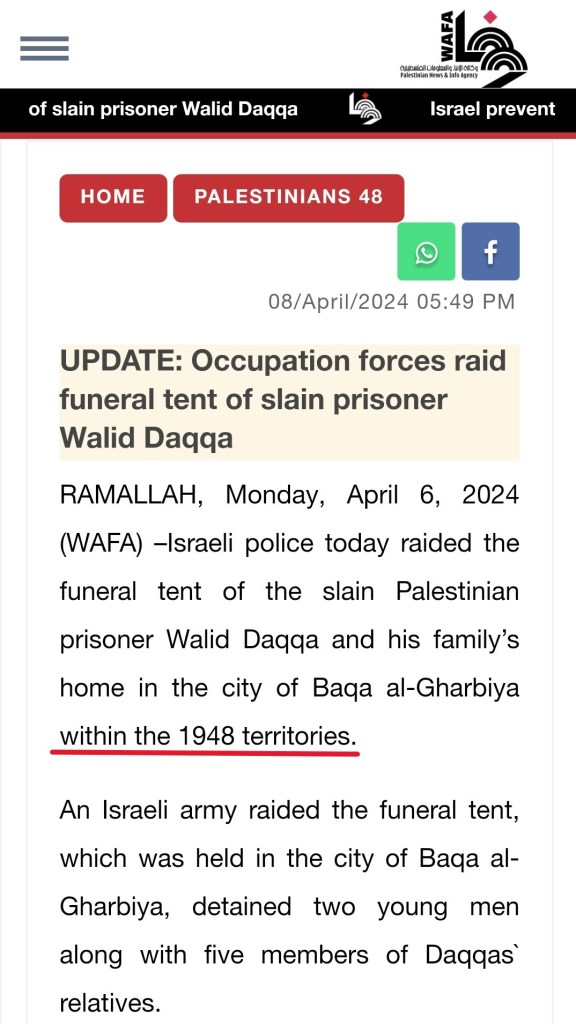 Not to be outdone in rewriting history of the past and present, Wafa, the official news agency of the supposedly “moderate” Palestinian Authority, condemned Israel for detaining two people at Daqqa’s funeral tent inside Israel, referring to the Jewish State, as “1948 territories.”
